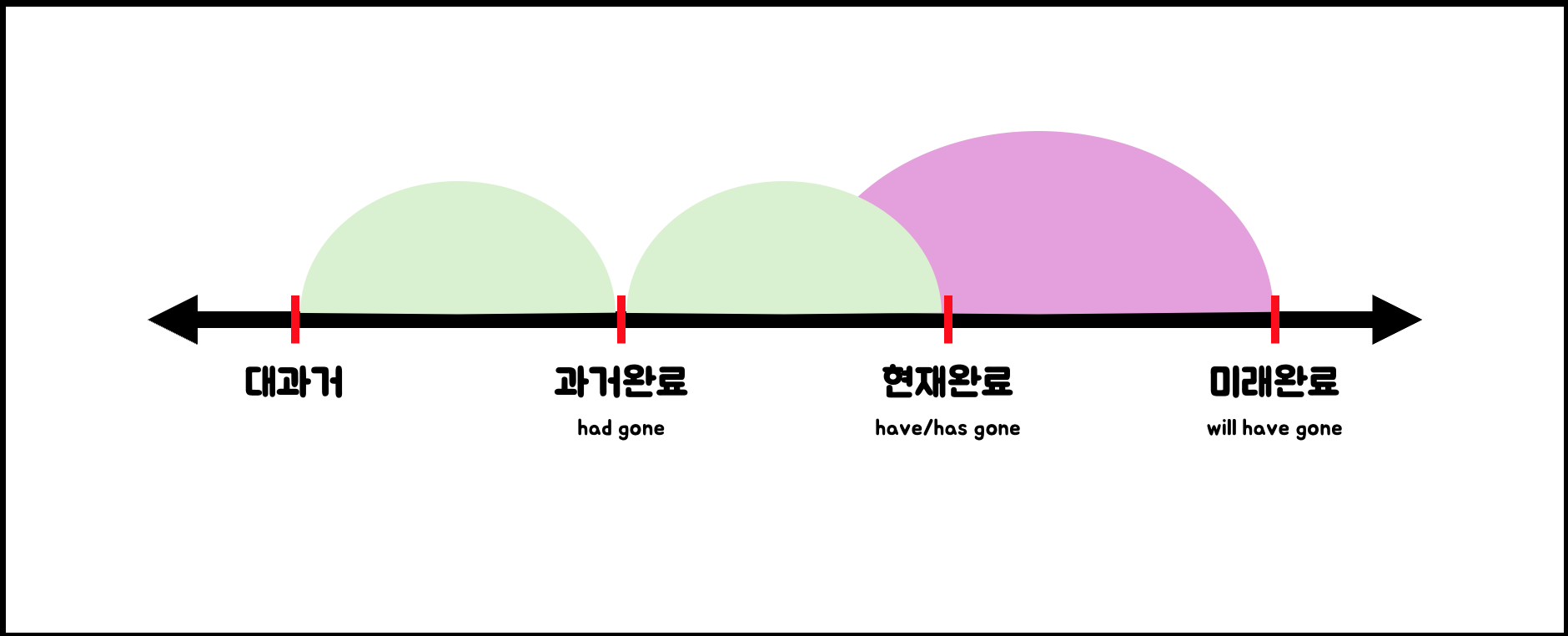 {:height 287, :width 689}과거완료 : 대과거에서 과거 사이에 일이 완료되었음. 현재완료 : 과거에서 현재 사이에 일이 완료되었음. 미래완료 : 시작시점은 중요하지 않음. 완료되는 시기가 미래 시점이면 미래완료. #+END_EXTRA